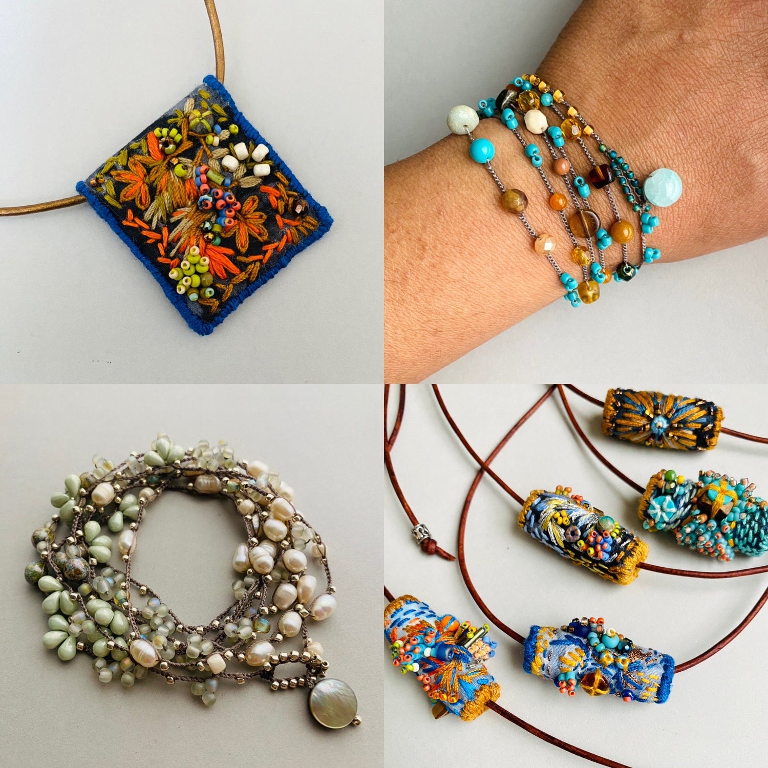 One-of-a-kind, hand-crafted small pieces of wearable art featuring crochet, embroidery, weaving and beading.