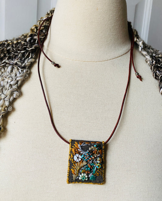"Flying dove" Aqua, gold, tan embroidered, beaded textile necklace.Vendor:Akijo DesignsRegular price $65.00 USDRegular priceUnit price / per