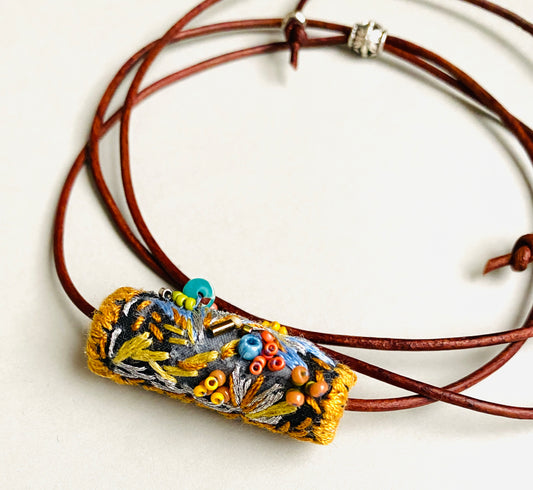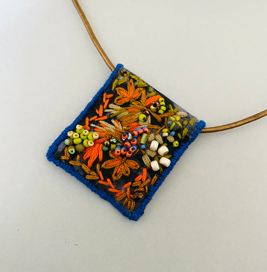 "Zinnias" Light blue and orange embroidered, beaded textile necklace.Vendor:Akijo DesignsRegular price $65.00 USDRegular priceUnit price / per-