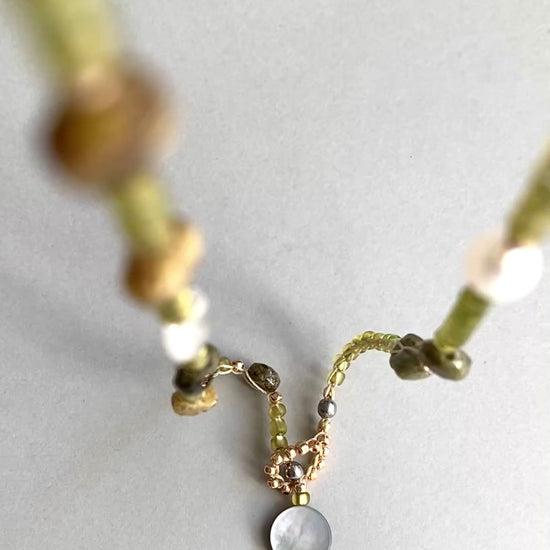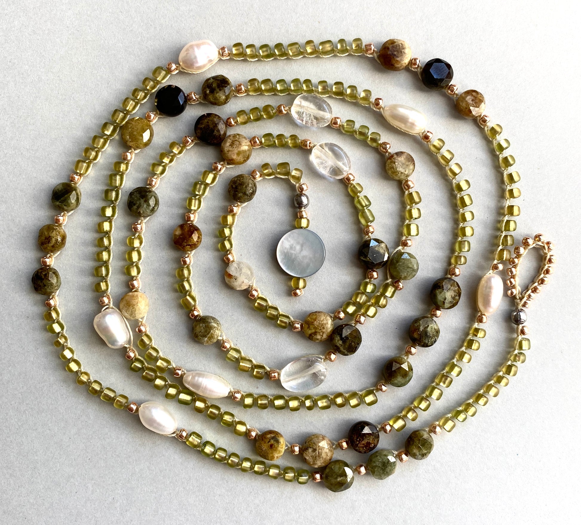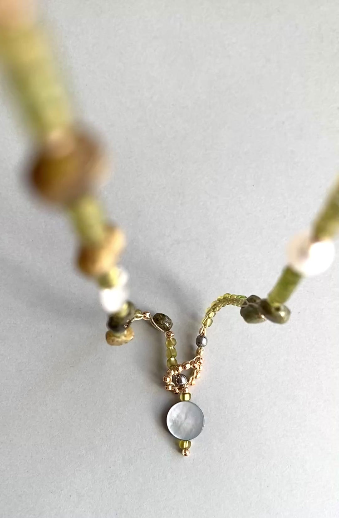 Crochet necklace or wrap bracelet featuring a subtle blend of semi precious green garnet stone beads, clear crystal, fresh water pearls and glass seed beads crocheted onto pale tan nylon cord. Fastens with an abalone shell bead and loop closure.