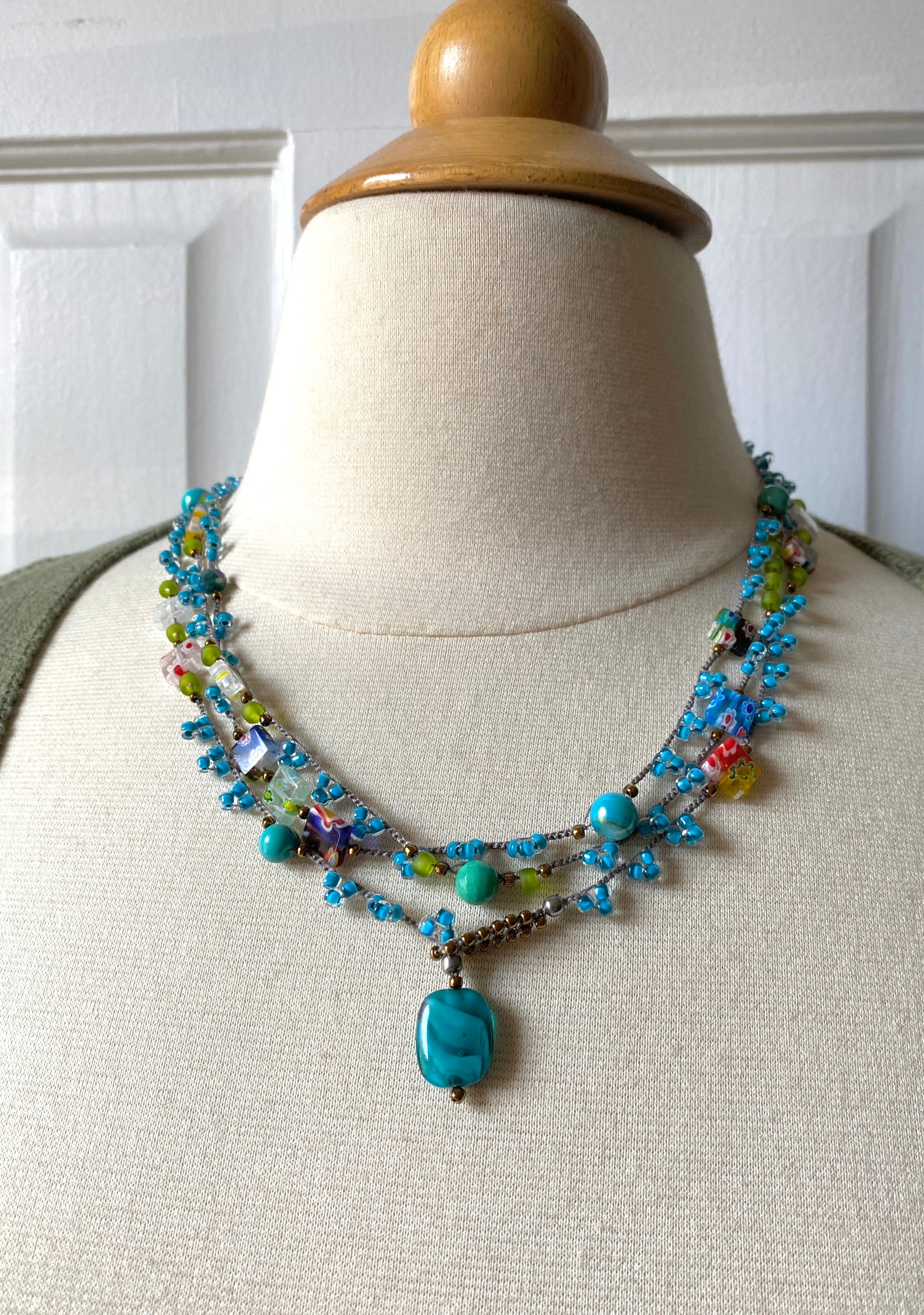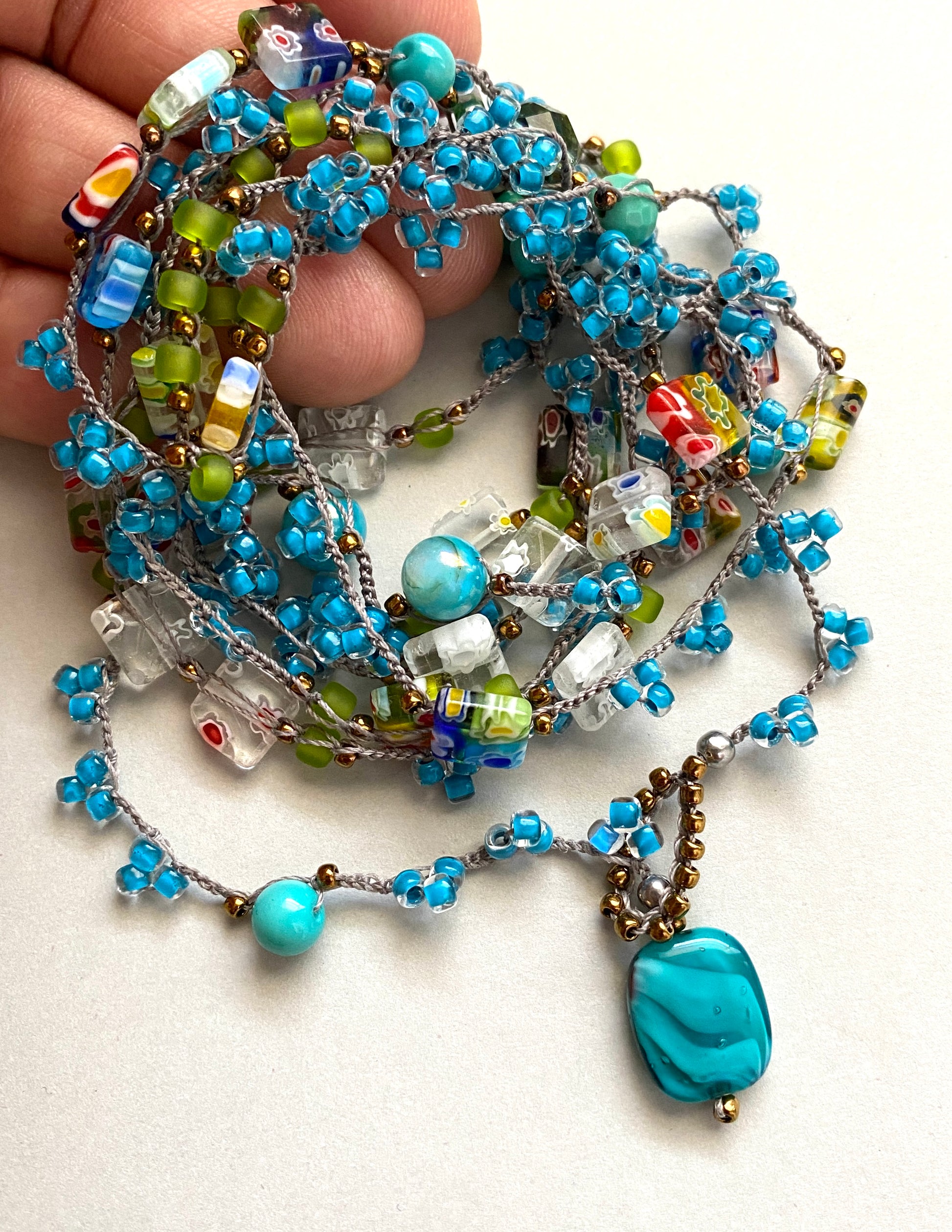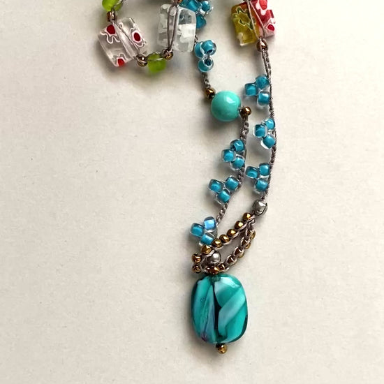 One of a kind, colorful and delicate statement necklace made of lovely mix of glass millefiori, seed beads and natural stone beads. Fastens to the front with a glass bead and loop.