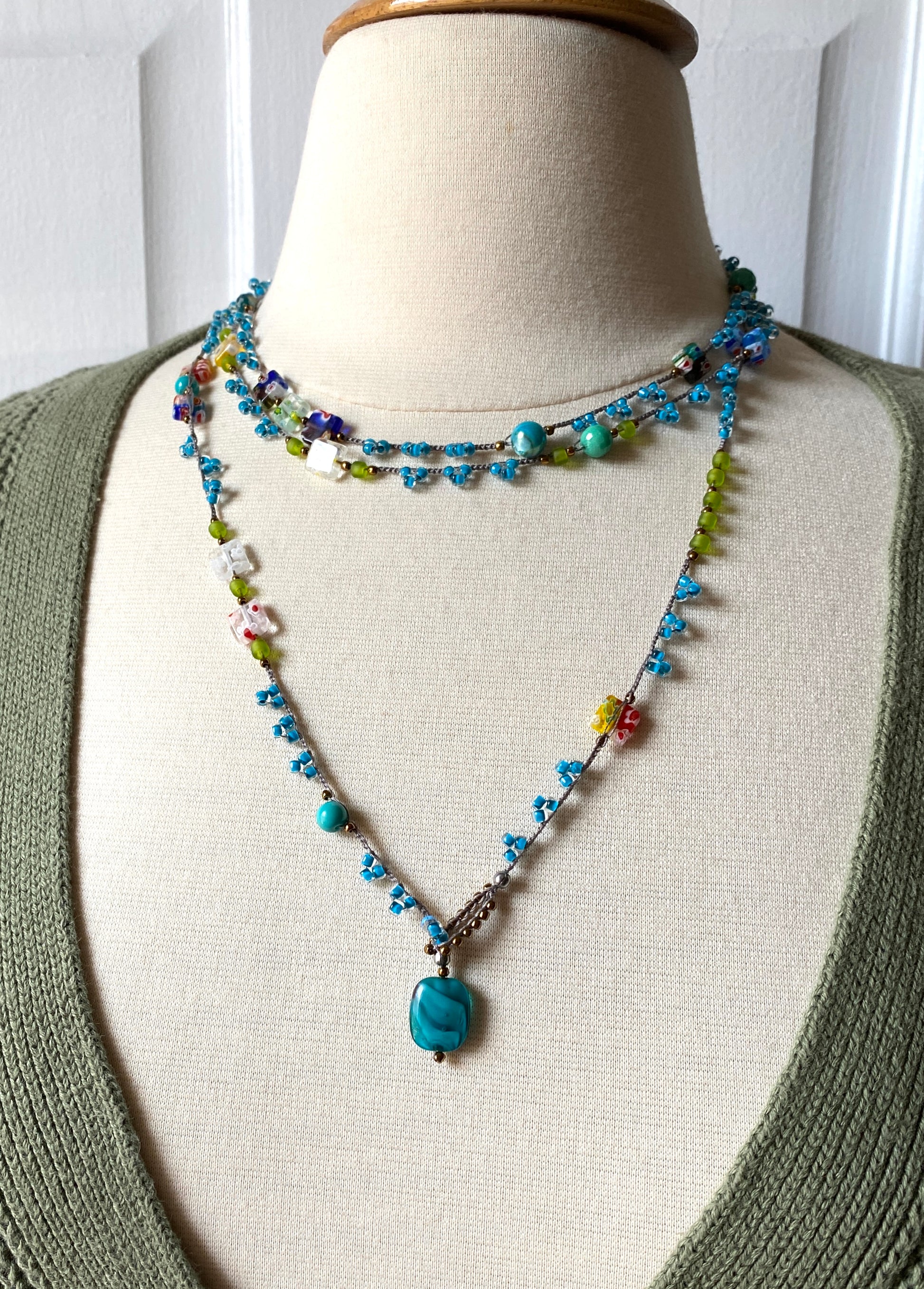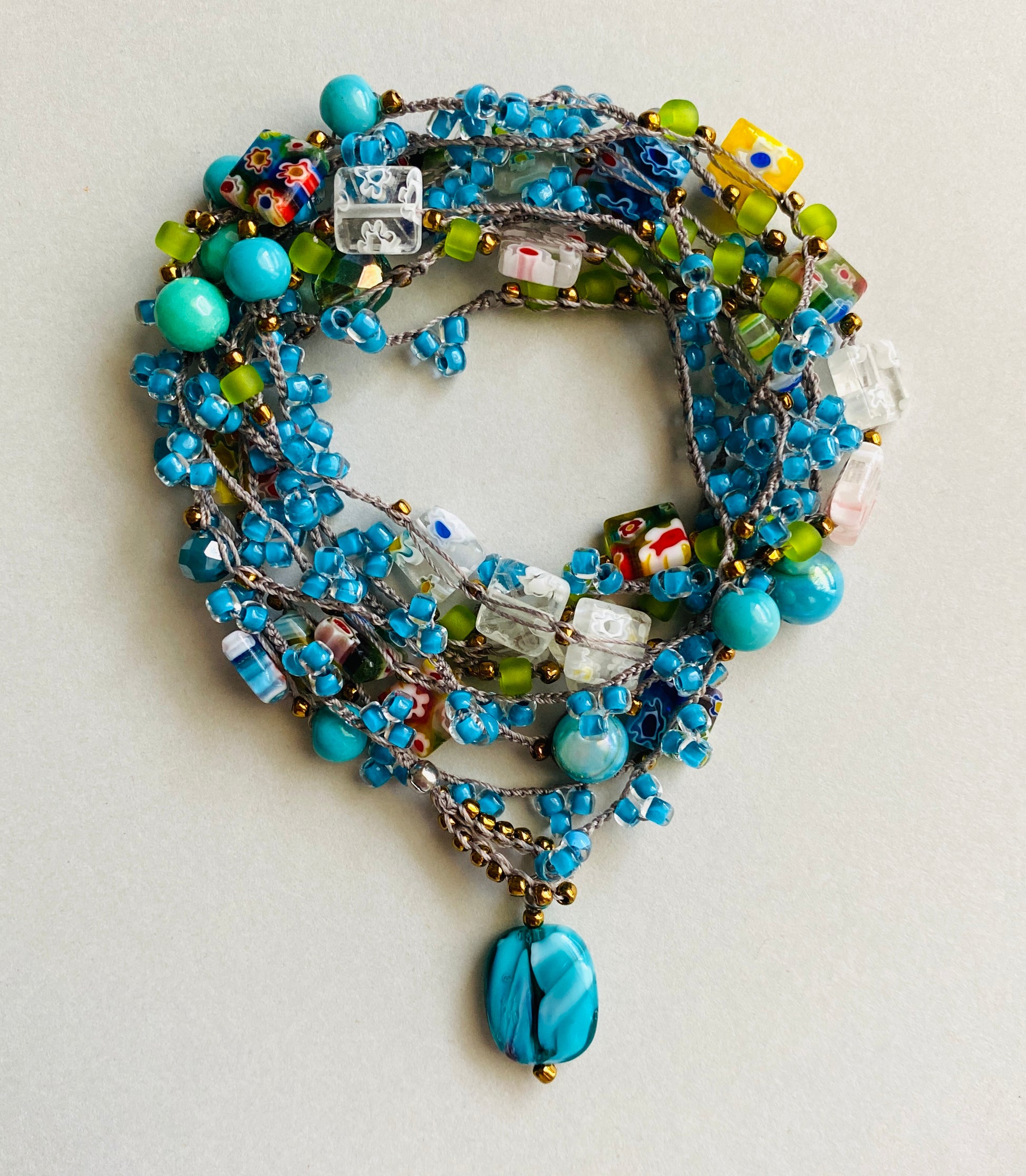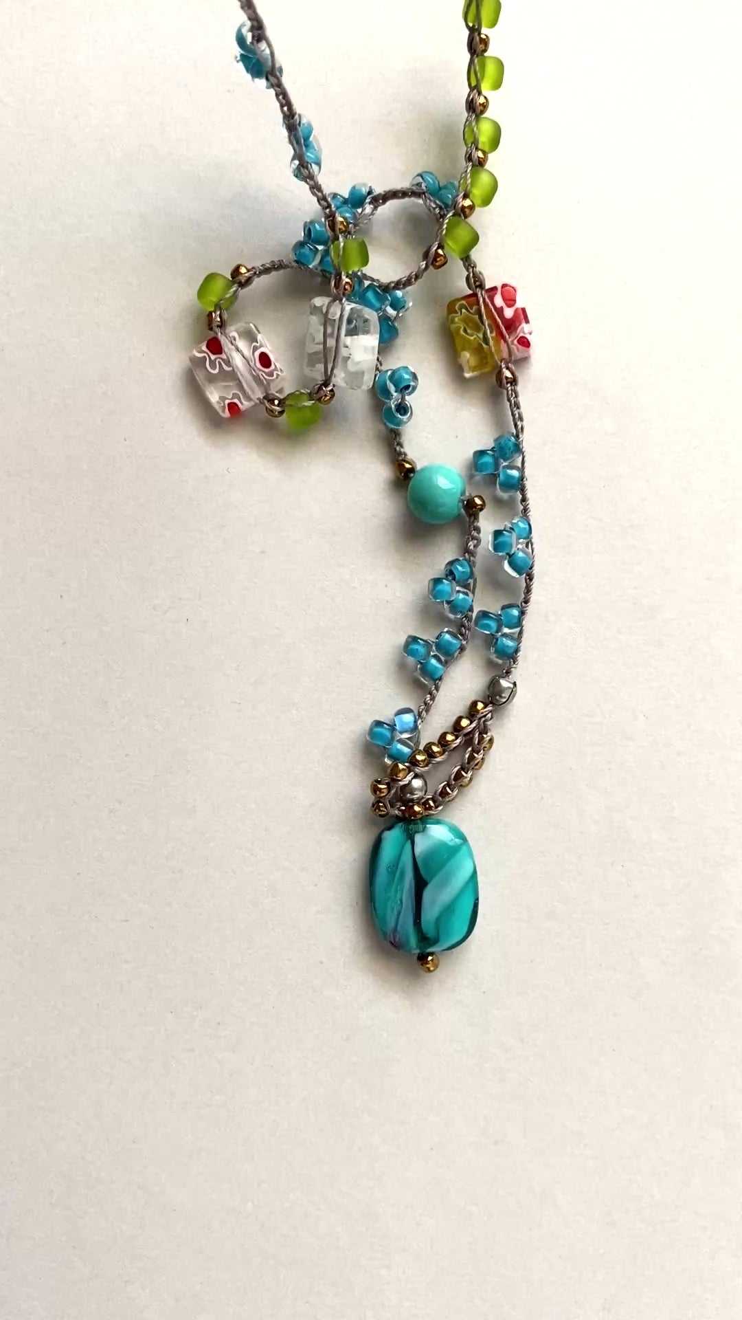 One of a kind, colorful and delicate statement necklace made of lovely mix of glass millefiori, seed beads and natural stone beads. Fastens to the front with a glass bead and loop.