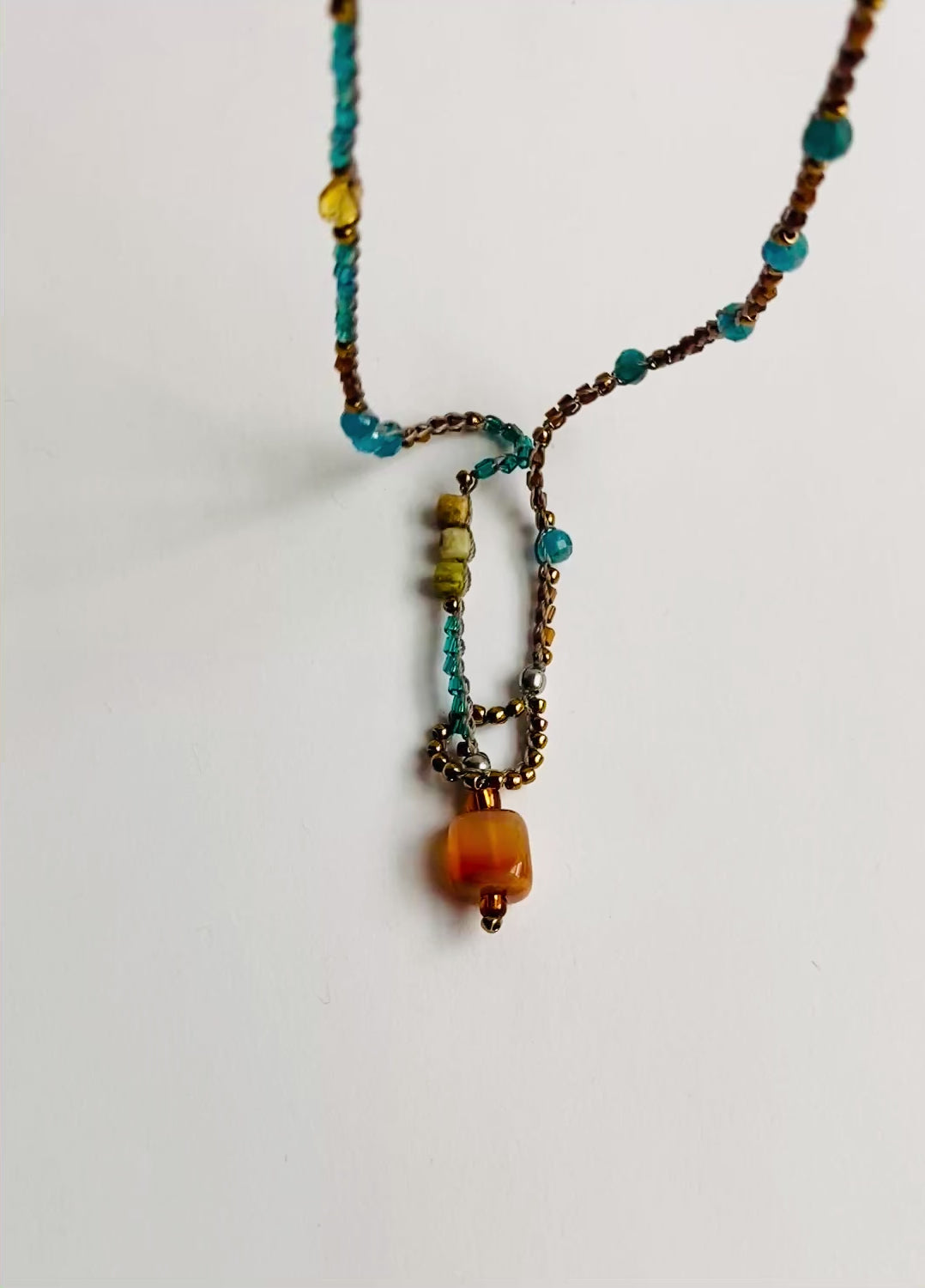 Delicate, one-of-a-kind crochet necklace or wrap bracelet featuring lovely semiprecious blue apatite beads, complimented with Japanese glass seed beads and Czech glass beads, crocheted onto nylon thread in tan. Closes with a semiprecious carnelian bead and loop.